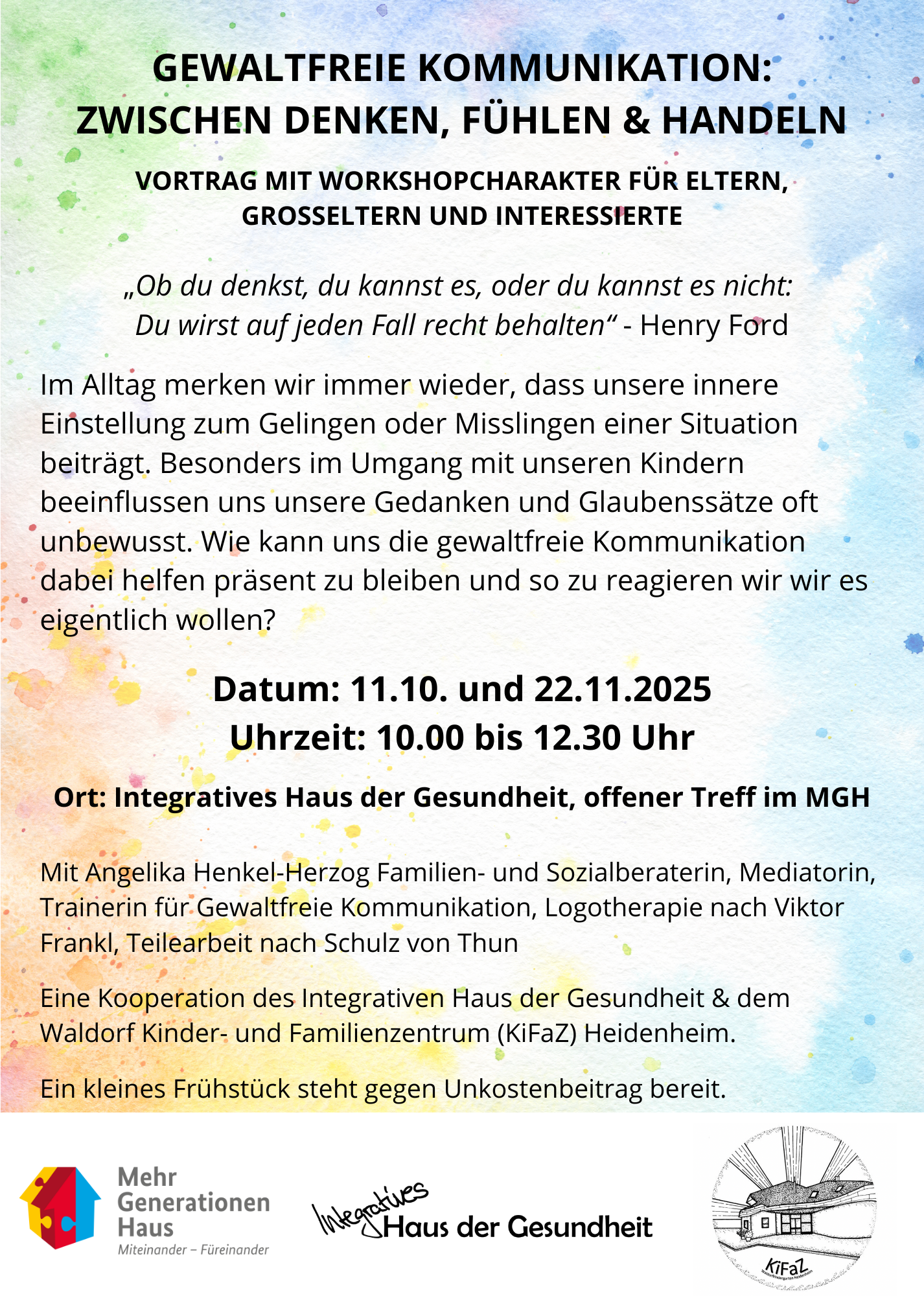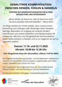 Gewaltfreie Kommunikation Datum/Zeit 11/10/202510:00 - 12:30 Veranstaltungsort Integratives Haus der Gesundheit