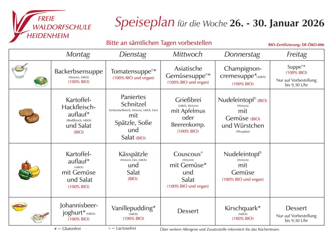 Hier finden Sie immer den aktuellen Speiseplan unserer Schulküche.